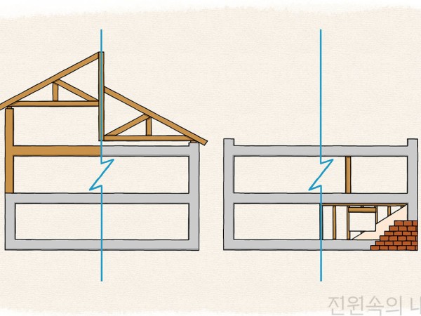“지하와 경사지에 적용하되접합부에 특히 유의해야”GOOD IDEA● 목구조는 수분에 약하고, 토양은 수분을 많이 머금고 있기 때문에 직접 접촉할 수밖에 없는 지하나 경사지에는 적용하기 어렵습니다. 수분에 강한 철근콘크리트를 이런 부분에 적용해 보완할 수 있다는 것이 하이브리드 구조의 대표적인 장점입니다.● 철근콘크리트 골조에 목구조 지붕을 적용하는 것도 흔히 볼 수 있는 하이브리드 구조입니다. 목구조 지붕은 상대적으로 높은 단열 성능을 제공하면서 가볍고, 또 트러스나 서까래와 같은 요소들을 통해 목재가 주는 아름다움도 느낄 수 있습니다.● 콘크리트 기초 위 2층 목조주택이나, 콘크리트 1층 위에 2층 목조주택을 지어 3층 주택을 만드는 것은 시공 방식으로는 크게 다르지 않습니다. 높은 층수와 목구조, 모두 원한다면 하이브리드 구조가 대안이 될 수 있습니다.● 철근콘크리트구조로 넓은 공간을 만든 뒤 목구조 벽(우드월)으로 내·외벽을 구성하는 방식도 하이브리드 구조라고 할 수 있습니다. 콘크리트 비내력 내·외벽보다 철거가 용이해 가족의 라이프스타일 변화에 대응하기 좋습니다.BAD IDEA■ 하이브리드 구조는 철근콘크리트구조보다 비용을 아낄 수 있을 것 같지만, 장비와 인력은 구조마다 각각 따로 필요로 하고, 결합 부위의 단열과 마감재 시공에 품이 많이 들어가 의외로 시공비는 크게 줄지 않습니다.■ 철근콘크리트구조와 목구조는 ‘소규모건축구조기준’의 적용을 받아 내진설계확인서와 구조설계도면을 제출하면 내진설계를 인정받을 수 있습니다. 하지만, 하이브리드 구조는 이 적용 범위에 포함되지 않아 별도의 구조계산이 필요합니다.■ 목구조 부분이 건조되는 과정에서 수축이 일어나게 되는데, 철근콘크리트는 수축이 거의 발생하지 않으므로 이 차이로 인해 결합 부위에서 마감재 손상이 발생할 수 있습니다. 하이브리드 구조는 목구조 함수율과 치수 변화에 더 주의해야 합니다.■ 철근콘크리트와 목구조가 결합하는 부분은 단일구조보다 구조, 단열, 기밀성에서 취약합니다. 따라서 연결철물의 정확하고 적극적인 사용, 기밀 및 방수 시공에 특히 신경 써야 합니다.취재_신기영| 일러스트_라윤희ⓒ 월간 전원속의 내집 / Vol.239www.uujj.co.kr [이 게시물은 전원속의내집님에 의해 2020-03-04 10:59:12 HOUSE에서 이동 됨]