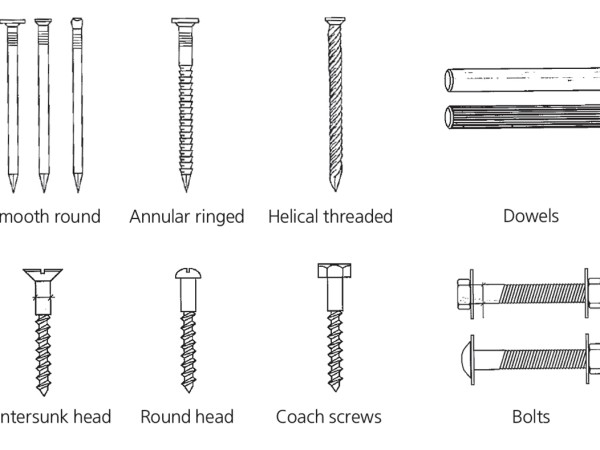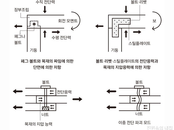 철근과 용접을 이용한 콘크리트구조와 달리, 목구조는 부재들을 연결해 하중을 지반에 전달한다. 결국 연결 부위의 접합 강도가 집의 내구성을 좌우한다.하중을 받는 부재는 동일한 하중을 다른 부재로 전달한다. 지상의 모든 목조 건축물의 하중은 최종적으로 지반에 전달된다. 하중은 힘의 형태로 전달되며, 힘이 가해지면 부재는 처지거나 휘어지거나 미끄러진다. 목재는 수종에 따라 약간의 차이가 있지만, 어느 한계까지는 탄성체이다. 이를 ‘탄성한계’라 한다. 즉 고무줄같이 휘어졌다가 다시 원상회복된다. 그러나 그 힘의 크기가 계속 증가되거나 지속되면, 목재의 변형은 고착화되어 영구변형 된다. 이를 ‘소성변형’이라 하며, 이 한계를 넘으면 부재가 저항할 수 있는 한계를 넘어서며 파괴된다. 이를 ‘취성파괴(물체가 외력을 받았을 때 소성 변형을 거의 보이지 않고 파괴되는 성질)’라 하는데, 이는 건축물의 갑작스런 붕괴로 이어질 수 있다. 부러진 나무젓가락이 원래 모양으로 완전히 회복되지 않는 것과 동일한 이치이다. 따라서 구조 설계 시에는 하중은 물론, 하중 기간에 대한 검토가 반드시 필요하다.목구조의 부재 간결합을 위한 방식구조재로 쓰이는 목재는 대부분 직선으로 제재되어 건조 후 사용된다. 건축물에는 수직 방향의 부재, 수평 방향 또는 경사진 방향의 부재끼리 연결이 필요하다. 이 연결부, 즉 조이스트(Joists)를 어떻게 시공하느냐에 따라 구조물의 강도가 결정된다. 철근콘크리트나 강구조는 철근이나 용접을 이용한 일체화한 강결 구조이나 목재는 그렇지 않다. 전통 방식의 짜맞춤이나 못(Nails), 스크류(Screw), 볼트(Bolts), 리벳(Rivet) 등의 체결철물(Fastners)을 사용하여 결합함으로써 하중을 전달한다.[그림 1] 목조주택용 체결구(Fastners)의 종류[그림 2] 상판과 다리를 결합하는 3가지 방법 같은 목재로 동일한 사이즈의 테이블을 만들었을 때 [그림 2] 방법 중에 어떤 것이 가장 튼튼할까? 구조역학DMF 잘 모르는 사람이라도 일반 못보다는 철물이나 짜맞춤 방식이 견고하다고 생각할 것이다. 이것은 접합부의 중요성을 보여주는 단적인 예다. 실제로 목구조 설계 시 접합부의 강도를 확보하기 위하여 부재 치수를 크게 하는 경우도 있을 만큼, 접합부의 강도는 건축물 전체의 강도와 직결된다. 경골목구조에서 일부 부재를 글루램(공학목재)으로 시공하는 경우 특히 주의를 요하는 이유다. 즉 글루램의 하중을 검토하는 것보다 양 끝단 접합부의 강성을 검토하는 과정이 반드시 선행되어야 한다.접합부 강도에큰 영향을 미치는못의 종류와 품질경골목구조와 중목구조는 서로 다른 형태의 접합 형식을 가지고 있다. 이번 회에는 경골목구조의 접합부에 대하여 알아보기로 하자. 경골목구조는 구조재와 못을 이용한 접합구조형식이다. 물론 홀다운 철물과 앵커 등은 볼트로 체결하기도 하지만 주요 부재 간의 접합부는 못으로 연결한다. 따라서 못의 품질은 접합부 강도에 중요한 영향을 미친다. 반드시 시방서에 규정된 못을 사용해야 하는데, 현실에서는 그렇지 않은 현장도 많다. 접합부 강도는 못의 강도 외에도 못과 목재의 매립 강도(Embedded Strength)에 의해서 결정된다. 이는 못의 표면과 목재간 마찰력, 목재의 강도 등이 서로 작용하여 뽑힘에 저항하는 힘을 말한다.[그림 3] 못의 응력을 보여주는 체결의 예 앞 장의 그림은 경골목구조의 전단벽에 OSB합판과 스터드(Stud)간 못을 박은 모습이다. 전단벽은 횡방향 하중과 수직하중을 받기 때문에 이로 인해 목재와 합판 사이는 전단력이 작용하게 된다. 이때 못에는 이 힘에 저항하는 전단응력과 인장응력, 휨응력이 복합적으로 발생한다. 즉 못 자체의 강도와 목재와의 뽑힘 강도로 하중에 저항하는 것이다.미국 NDS 규정에는 못 하나 하나의 저항능력에 대하여 실험식을 규정해 놓았다. 구조설계자들은 전단벽 전체의 하중과 못의 응력을 수치화하여 필요한 못의 개수와 못끼리의 간격을 설계한다. 못의 개수와 시공 간격 외에도 못 표면이 어떠한가도 중요한 변수로 작용한다.[표 1] 체결 철물의 종류에 따른 전단응력 인장력을 받는 못이나 스크류 등 체결장치 표면이 나사산(Threading)으로 되어 있거나 원형링 형식으로 홈이 파인 경우에는 목재 간 전단응력이 높아지기 때문에 더욱 견고한 벽을 만들 수 있다. [표 1]의 공식으로 체결철물의 종류에 따른 전단응력을 가늠해 볼 수 있다.규정에 의해 인증된접합 철물의 종류스크류를 이용하여 합판과 구조재를 체결했을 때, 일반 못을 쓸 때보다 전단응력이 2배 향상되는 것을 알 수 있다. 또한, 와셔를 사용하면 전단응력이 향상되어 더 강도 높은 구조물을 만들 수 있다. 이는 ‘로프 효과(Rope effect)’라 불리며, 유럽에서는 이를 설계에 적용하도록 규정하고 있다(Eurocode 5).북미 목조주택에서도 미국 ICC(International Code Council) 국가 규정에 의해 인증된 심슨스트롱타이(Simpson strong tie)社의 체결철물을 주로 사용한다.[그림 4] 심슨스트롱타이의 목조주택용 체결철물 [그림 4]는 보와 장선이 만나는 부분의 장선걸이와 스터드(Stud) 등에 각종 배선을 위해 구조재를 천공하는 경우, 접합철물을 어