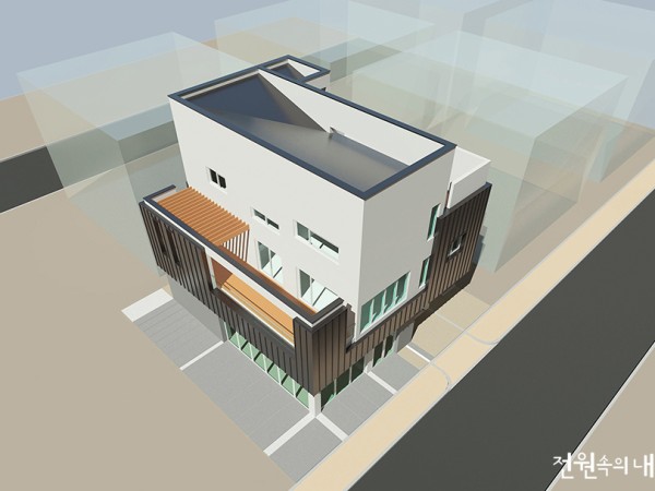 어떻게 집을 지어야 할지 시작조차 막막해 하는 건축주를 위해 101ROOF 여용진 소장이 해결책을 제시하는 코너. 이번은 그 마지막 회로 매달 심도 있는 설계안으로 풍성한 정보와 아이디어를 준데, 여용진 소장께 독자들을 대신해 감사를 전한다.자료구성 ㈜일공일룹 101ROOF 정리 김연정가족구성4인 가족- 40대 후반의 직장인 가장- 전업주업인 아내- 고등학교 2학년 아들- 중학교 2학년 딸건축주 요구사항고민이 많았던 건축주가 사무실을 방문했다. 도심 택지지구 안에 땅을 마련하여 집을 짓는 건축주는 기대 반 걱정 반이었다. 살고 있던 아파트를 떠나 주택을 건축하는 것이, 더군다나 상가주택을 건축한다는 것이 옳은 것인지에 대한 생각을 항상 하고 있었다. 건축주의 요구는 상가주택을 짓고자 하는 건축주들의 고민이 그대로 담겨 있었다. 주택의 프라이버시 확보에 대한 걱정, 주택이 상가 윗층으로 올라가면서 행여나 아파트와 같은 삶의 연장은 아닌지에 대한 걱정 등으로 한숨이 깊어졌다.먼저 건축주가 제시한 요구조건들은 아래와 같다.01 상가와 주택 간 동선 간섭의 최소화02 상가주택이 가지는 마당공간의 핸디캡에 대한 최대 배려03 비를 맞지 않는 주차장을 설치하되 향후 확장할 수 있는 공간 구성대지환경택지개발지구 내 대지로서, 정방형에 가까운 형태를 취하고 있다. 대지의 동측은 8미터 도로에 접해 있고, 남측으로는 주차장이 위치하고 있다. 전형적인 택지개발지구 내 땅의 모습을 지니고 있지만, 주차장을 남측에 끼고 있어 택지개발지구 내 일반적 대지들보다는 양호한 트인 시야와 채광을 확보할 수 있는 조건이다. 대체적으로 1층은 임대상가가 주를 이루게 되고, 임대주택과 주인주거 혹은 주인주거 전용의 주택이 들어설 것으로 예상된다.건축제한요소제1종지구단위계획구역 내 토지로서, 제1종일반주거지역의 법률적 제한 이외에 지구단위계획지침을 준수하여야 하는 대지이다. 층수는 3층 이하로 제한되어 있으며, 용적률 역시 제1종일반주거지역 내 적용 용적률(180%)보다 다소 낮게 지정되어 있다. 정북방향에서 일조권을 적용하는 것이 일반적이지만, 지구단위계획지침으로 정남방향으로 일조권을 적용하도록 되어 있다.House Plan대지위치 : 충청남도 당진시대지면적 : 232㎡(70.2평)지역지구 : 제1종일반주거지역, 제1종지구단위계획구역건물용도 : 1종근린생활시설 + 단독주택 건물규모 : 지상 3층 건축면적 : 136.80㎡(41.38평) 연면적 : 82.13㎡(85.34평) / 철근콘크리트구조 - 120.33㎡(36.40평), 경량목구조 - 161.80㎡(48.94평) 시공면적 : 건축물 - 249.13㎡(75.36평) / 주차장 - 33.00㎡(9.98평) / 2층, 3층 마당 - 63.6㎡(19.24평) 건폐율 : 58.97%(최대 60%) 용적률 : 107.38%(최대 150%) 구조 : 1층 - 철근콘크리트구조 / 2, 3층 - 경량목구조 외부마감 : 스터코, 컬러강판 내부마감 : 바닥 - 원목마루, 벽 - 석고보드 위 친환경수성페인트, 천장 - 석고보드 위 친환경수성페인트 지붕재 : 아스팔트싱글 예상시공비 : 약 3억5천만원(가구공사 제외)계획방향(배치 및 외부공간과 동선)계획부지는 동측에 8m 도로가 접해 있다. 도로는 보행이 가능한 1.8m 폭의 보도와 아스콘포장 차도로 구성되어 있었다. 모든 진출입은 이 도로로만 가능하였기에 이를 이용해 계획했다. 1층 임대상가의 이용성 및 상층부 주택의 동선 등을 고려하여 상가와 주택 진출입로 사이에 주차장을 끼워 동선의 간격을 확보하였다.주거와 상가가 공존하는 환경에서 두 공간의 동선분리가 우선이었다. 최대건축가능영역 검토로 건축물의 블록과 매스를 결정하고, 정남일조권 적용으로 남게 된 남측 부지와 최대건폐율로 인한 도로측 잔여부지는 상가의 마당으로 사용한다. 동선 분리를 생각해 출입구의 위치와 주택의 진출입부분을 결정하였다.건축물은 3개의 블록으로 적층된다. 블록을 가지런히 쌓고 2층 외부공간의 형성을 위하여 밀고 자른다. 3층의 외부공간 역시 잘라내는 과정을 거쳐 완성되었다. 주택의 남측과 동측은 충분한 채광을 위해 너른 창으로 디자인하였고, 상가는 전면에 위치한 마당으로 확장이 가능하도록 폴딩도어로 공간을 구획했다.외피는 주택의 공간적인 특징을 그대로 반영하고자 했다. 1층 상가부분은 기능성과 개방감을 중시하여 주 외피에 유리를 설치하였고, 2층과 3층 주거부분은 흰색 스터코로 마감하였다. 각 외부공간은 컬러강판을 둘러 주택을 받치고 감싸 안는 느낌이 들도록 디자인하였다. 3층의 경우 인접한 건축물의 시선 등을 고려하여 높은 담을 형성하였다.내부공간계획건축물은 1층의 임대상가와 2층 및 3층의 단독주택으로 구성된다. 공용공간과 부부공간은 2층에, 자녀공간을 3층에 계획하였다. 각 층별 공간은 거실의 오픈부분을 통하여 시각·청각적으로 연계될 수 있도록 하였다. 이번 제안의 핵심은 각 층마다 확보된 외부공간(마당)이다. 저층부의 상가는 각종 제한으로 남게 된 부지를 활용하여 작은 마당을 만들었고, 상층부의 주택은 층별로 남측과 북측에 각각 마당을 구성하였다. 마당은 2층의 거실과 3층의 홀에서 연계되도록 계획되었다.㈜일공일룹 101ROOF ‘사람과 100년을 함께 하는 공간’을 만들어 나가기 위