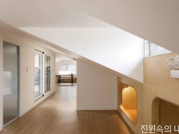 우리의 시간을 마음 놓고 맡길 수 있는 집을 찾아 드디어 발견한 곳. 가족의 추억이 집 안 곳곳에 하나 둘 쌓여간다.경기도 시흥시 은계지구에 신축된 상가주택. 이곳의 4층에 주거공간을 마련한 가족은 그들에게 꼭 맞는 집을 만들고 싶었다. 인테리어 키워드는 ‘휴식’과 ‘추억’. 언제든 편히 쉴 수 있고, 아이가 커가면서 다양한 체험을 함께 아로새길 수 있는 곳. 여기에 다락을 활용하는 등 오랜 로망을 품고 집을 온전히 가족을 위해 꾸며줄 업체를 찾아다녔고, ‘홍예디자인’을 만나 그 꿈이 구체화되었다.하부장을 두어 수납을 확보한 현관. 한쪽 벽에는 그림을 걸어 화사하게 연출했다.가족이 가장 오랜 시간 머무는 거실은 심플하면서도 안락하게 꾸몄다.POINT 1_여러 기능을 갖춘 계단실 계단실 옆의 여유 공간은 작품을 전시하고 자주 쓰이는 물건을 놓는 등 다양한 활용이 가능하다. 계단을 따라 유리 난간을 설치해 안전성은 물론, 더욱 개방감이 느껴지는 실내 인테리어를 완성했다. POINT 2_실용성과 쾌적함을 갖춘 보조주방슬라이딩 도어 안쪽으로는 보조주방을 마련했다. 이곳에는 냉장고와 세탁기, 건조기를 두고, 싱크볼과 가스레인지를 설치해 간단한 손빨래를 하거나 냄새나는 음식을 마음껏 조리할 수 있다. POINT 3_가족의 추억이 쌓여갈 발코니 방을 하나 더 내는 대신 발코니를 만들었다. 외부와 개방된 느낌으로 가족이 함께 시간을 보낼 수 있는 공간이다. 여름이면 이곳에서 물놀이를, 겨울이면 눈사람 만들기를 즐길 수 있다.유광 대형 타일로 힘을 준 주방. 대리석 무늬가 이어지며 예술적인 포인트가 되어준다.계단실 옆과 복도 끝에는 그림을 걸어두고 지나가며 감상할 수 있는 공간을 마련했다.거실에서 곧바로 이어지는 다이닝룸과 주방은 실용적이면서도 여유를 품은 공간이다. 발코니를 마주하는 다이닝룸에서는 가족의 단란한 식사가 이루어진다. 주방의 중심에는 3m에 달하는 아일랜드를 놓았다. 요리하는 동안에도 그 너머로 아이를 돌볼 수 있고, 간단하게 바로 식사하기에도 좋게끔 대면형 구조로 만들어 활용도를 높였다. 창가에는 하부장을 두어 주방가전들을 올려두고 사용할 수 있도록 했으며, 안쪽으로는 보조주방이 있어 더욱 효율적인 공간 활용이 가능하다.실내는 넓게 확장되어 있으면서 동선의 편의를 고려한 긴밀한 연결성으로, 허전한 느낌이 아닌 촘촘한 구성으로 다가온다. 복도를 지나면 사적인 공간이 자리하는데, 안방은 그 안으로 드레스룸과 욕실을 품었다. 아늑한 침실과 이어지는 드레스룸은 스타일러와 화장대까지 콤팩트하게 갖춰 효율적인 쓰임새가 돋보이며, 그 안으로는 길게 세면대를 둔 욕실이 있어 편리하게 이용할 수 있다. 아이방 역시 방 안에 들어서면 공부방과 침실, 드레스룸까지 곧장 이어지게끔 만들었다. 공부방은 지금은 엄마의 서재로도 쓰이고, 세 식구가 즐거운 놀이 시간을 보내는 곳으로도 활용되지만, 앞으로 아이가 자라면 그에 맞게 용도가 달라질 것까지 세심히 배려해 설계한 공간이다.심플하게 꾸민 침실. 침대 프레임 쪽에는 벽부등과 다크 그레이 컬러로 포인트를 주었다.콤팩트하게 구성한 드레스룸 안쪽으로는 비비드한 컬러로 꾸민 파우더룸과 모서리에 거울을 두어 넓어 보이는 효과를 준 욕실이 자리한다.INTERIOR SOURCE대지위치≫ 경기도 시흥시거주인원≫ 3명(부부 + 자녀 1) 건축면적≫ 152m2(46평)단열재≫ 경질우레탄보온판 2종 1호 140T 창호재≫ LG하우시스 슈퍼세이브 7|에너지원≫ 가스보일러 내부마감재≫ 벽 - 던에드워드 친환경 도장, 개나리 벽지 / 바닥 - 원목마루|욕실 및 주방타일≫ 팀세라믹, 티엔피세라믹 수전 등 욕실기구≫ 아메리칸스탠다드 주방 가구·붙박이장≫ 제작 조명≫ 도우라이팅, 대광조명 계단재·난간≫ 철제 난간 에폭시 및 도장 마감 / 통유리 난간 현관문≫ 단열방화문 + 도장|중문≫ 이노핸즈 방문≫ 영림도어 + 던에드워드 도장 마감|벽난로≫ 삼진벽난로 시공≫ 홍예디자인 / ㈜야탑종합건설 설계≫ 마당건축 인테리어 디자인≫ 홍예디자인 02-540-0856 https://blog.naver.com/only3113아이 공부방. 책장형 슬라이딩 도어를 열면 침실으로 들어갈 수 있다.아이방 침실 안쪽으로는 다시 드레스룸이 이어진다.아빠의 작업 공간이자 부부가 오붓한 시간을 함께 하기도 하는 서재. 채광이 좋아 오래 머물러도 답답하지 않다.계단을 오르면 이 집의 백미, 다락과 마주하게 된다. 가족의 오랜 꿈이 이루어진 곳으로, 한쪽으로는 서재가, 다른 한쪽으로는 아이의 놀이방이 펼쳐진다. 서재는 아빠의 바람대로 사방이 전부 책장으로 채워졌다. 한편에는 벤치를 두어 부부는 나란히 앉아 책을 읽고 서로의 취미생활을 즐길 수 있으며, 언제든 함께 이야기 나누는 특별한 장소를 또 하나 얻었다. 맞은편 아이 놀이방에는 천장의 경사 하부를 활용해 벙커를 만들었다. 이곳에서 잠을 청할 수도 있고, 조명을 켜고 작은 카페 놀이를 할 수도 있어 아이가 즐겨 찾는다고. 다락은 드레스룸과 수납 창고로도 쓰이며 멀티룸으로서의 역할 또한 훌륭히 해낸다. 집의 남는 공간이 아닌, 여러 용도로 활용할 수 있어 더욱 즐겁고 편리하