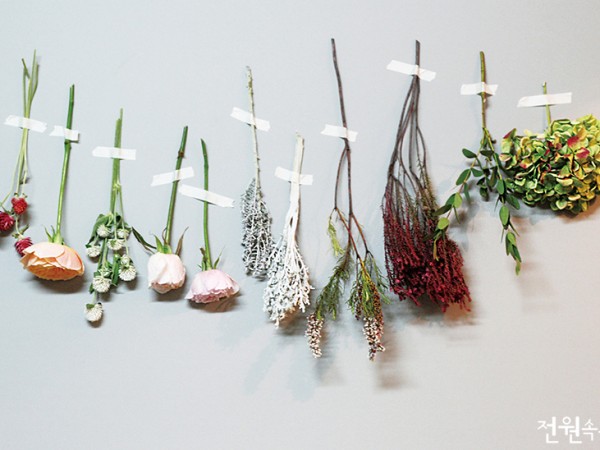 탐스러운 생화도 예쁘지만, 드라이플라워도 제 나름의 은은한 멋과 분위기가 있다. 손대면 금방이라도 바스러질 것 같은 꽃잎이 오히려 청초하고, 세월에 바랜 듯한 빛이 추억을 떠올리게 한다. 무심한 듯 묶은 꽃다발은 벽에 걸어 말리기만 해도 근사한 인테리어 소품이 된다.취재 조고은 사진 제공 제이스플로라 www.sweetpea9.blog.me드라이플라워는 누구나 집에서 쉽게 시도해볼 수 있다. 선물 받은 꽃이 처치 곤란일 때 활용하기 좋고, 요즘엔 말려서 장식으로 쓰려고 일부러 꽃을 사는 이들도 많다. 드라이플라워를 위한 꽃을 고를 때는 줄기가 단단하고 꽃잎과 화형이 크지 않되 줄기, 꽃잎에 수분이 적은 꽃이 좋다. 손으로 만졌을 때 거친 느낌의 꽃이 제격이다. 자나 로즈, 아이스윙, 수국, 천일홍, 스타티세, 미스티블루 등이 이에 해당한다. 카라처럼 꽃잎에 수분기가 많고 화이트 컬러인 꽃은 말리면 변색될 수 있어 권하지 않는다. 소재로는 유칼립투스, 구름비나무, 브루니아 등이 좋은데, 특히 유칼립투스는 건조 후에도 향이 지속되며 변색 없이 오래 두고 볼 수 있다. 꽃을 말리는 방법에는 실리카겔, 붕사 등의 건조제나 글리세린, 알코올 등의 용액을 이용한 화학적 건조법, 꽃을 소량의 물에 담가 건조시키는 드라잉 워터법 등도 있지만, 집에서 손쉽게 따라 하기엔 자연 건조법이 가장 해볼 만하다. 이때 꽃은 바로 세워 말리면 머리(꽃송이)가 꺾일 위험이 있으므로 거꾸로 매달아 말려야 한다. 꽃의 줄기보다는 머리가 무겁고 수분을 더 많이 머금고 있기 때문이다. 이는 유칼립투스, 브루니아 같은 소재들도 마찬가지다. 습기가 많은 곳, 직사광선을 받는 곳을 피하는 것은 기본이다.꽃은 싱싱할 때 말리기 시작해야 한다. 시들기 시작하면 아무리 잘 말려도 냄새가 나고 색이 변하기 때문이다. 먼저 줄기와 잎을 다듬어 적당한 길이로 자른 후, 몽우리 상태의 꽃은 물꽂이를 해준다. 찬물로 매일 갈아주면 일주일은 거뜬히 두고 볼 수 있는데, 꽃이 적당히 피어나면 시들거나 상하기 전 말리면 된다. 적당히 피어있는 꽃이라 바로 말릴 때도 물올림을 하여 꽃의 모양이 예쁘게 잡혔을 때 말리는 것이 좋다. 만개한 꽃은 상한 잎을 떼어내고 거꾸로 매달아 말리면 된다.◀ 드라이플라워 벽 장식잎과 줄기를 다듬은 꽃을 무심하게 묶어 벽에 걸어두는 것만으로 집 안 분위기가 한층 따뜻해진다. 꽃이 상하지 않고 예쁘게 마르게 하기 위해서는 바람이 잘 통하는 곳에 걸어두어야 함을 잊지 말자. 마르기 시작하면 줄기가 가늘어져 묶어둔 끈에서 빠지기 쉬우니, 가끔 다시 매어줘야 한다.▶ 드라이플라워를 활용한 선물 포장화려한 포장지가 없더라도 드라이플라워, 트와인끈 혹은 마끈만으로 충분히 세련된 선물 포장을 연출할 수 있다. 사진에는 비단향, 유칼립투스 드라이플라워를 사용했다.▲ 구름비나무 리스꽃 시장에서 저렴한 가격에 살 수 있는 구름비나무. 잎이 수분을 많이 머금고 있지 않아서 오래 말릴 필요가 없다. 또, 잎의 앞뒷면 색이 달라 별다른 소재 없이도 깔끔하고 예쁜 리스를 제작할 수 있다.수국 드라이플라워로 캔들리스 만들기수국은 꽃잎에 수분이 많이 필요한 꽃이다. 그만큼 수분이 부족할 때 물 내림도 빠른 편이라 비교적 쉽고 빠르게 말릴 수 있다. 색이 연한 수국보다는 앤틱수국처럼 짙은 컬러의 수국이 변색이 적다. 특히, 작은 꽃들이 모여 볼륨을 형성하는 수국은 특별한 기술 없이도 동그랗게 잘 만들어진다. 완성된 리스는 테이블 위 캔들과 함께 연출하면 따뜻한 실내 분위기가 연출된다. 꽃을 와이어링하는 것이 어렵다면, 드라이플라워를 글루건으로 단단히 고정하는 것만으로도 리스를 쉽고 빠르게 완성할 수 있다.01 말린 수국을 적당한 볼륨감으로 줄기를 잘라준다.02 리스틀 위에 드라이플라워 수국을 글루건으로 단단히 고정한다.03 네 개의 수국을 먼저 십자 방향으로 큰 틀을 잡아 붙인다.04 사이사이 빈 공간을 채워나간다. 꽃잎에 글루건이 늘어나 붙지 않도록 주의하며 붙여준다.05 작게 자른 수국들을 빈틈이 없도록 빼곡하게 붙인다.06 준비해 둔 천일홍을 꽃 머리만 잘라 글루건으로 수국 위에 얹는 느낌으로 붙인다. 소이캔들 드라이플라워 데커레이션선물용이나 인테리어 소품으로 좋은 드라이플라워 소이캔들. 이미 완성된 캔들이 있다면 드라이어로 표면을 살짝 녹여 장식하면 된다. 드라이플라워를 얹을 때는 심지에 닿아 타지 않도록 거리를 좀 두고 꾸며준다. 01 녹인 소이왁스에 천연 오일을 넣어 섞은 후 컨테이너에 적당량 붓는다. 02 서서히 굳기 시작하면 스모그리스 심지를 나무젓가락에 끼워 수직을 유지해준다.03 소이왁스가 완전히 굳기 전, 준비한 드라이플라워들을 원하는 대로 꾸며주면 완성이다. 취재협조 | 제이스플로라 황유진 대표웨딩부케와 위클리 플라워 서비스를 전문으로 하는 플라워숍 ‘제이스플로라’를 운영하고 있다. 틀에 박히지 않고 다양한 플라워 디자인을 시도하고자 늘 소통하고 노력한다.www.sweetpea9.blog.me※ 월간 <전원속의 내집> www.uujj.co.kr 본 콘텐츠의 저작권은 (주)주택문화사에 있으며, 이를 무단 이용하는 경우 저작권법 등에 