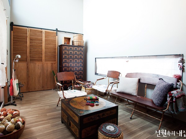 오래된 시골집이 있던 곳에 낡고 오래된 가구, 직접 뜨개질한 소품 등이 온기를 더하는 목조주택 한 채가 새로 자리 잡았다. 만만치 않은 내공의 인테리어 디자이너, 김혜정 씨가 손수 꾸민 집이다.취재 조고은 사진 전성근▲ 중정을 바라보며 앉아 뜨개질할 수 있는 거실. 나지막한 고정창에는 엄마의 유품인 원단으로 만든 바란스 커튼을 달았다.▲ 주방 겸 다이닝룸. 나무, 철재, 타일 등 다양한 소재를 자유분방하게 사용했다.Interior Source내벽 마감재 : 벽지 초배 후 삼화페인트 도장바닥재 : LG하우시스 강화마루욕실·주방 타일 : 을지로 은성타일테라스 바닥 타일 : 키엔호 타일 KSF-3 www.kienho.com욕실기기 : 아메리칸 스탠다드, 독일 철재 세면대주방 가구 : 아트주방 주문제작 조명 : 이태원 빈티지숍 씨앗 구입, 자체 제작계단재 : 멀바우, 구로 철판현관문 : 원목(오크) 제작방문 : 스킨도어서재 가구 : 책장 - 태산금속 주문제작, 책상 - 이태원 빈티지숍 씨앗인테리어 디자인 및 시공 : K-STYLING www.kstyling.net▲ 철제 캐비닛으로 신발장을 대신하고, 빈티지한 소품과 화분, 도자기로 꾸민 현관이다.▲ 2층 서재에선 아무렇게나 놓인 책들도 멋진 인테리어 소품이 된다. /언제 들였는지도 모를 손때 묻은 소품들이 집 안 곳곳을 장식한다.▲ 그녀의 집에는 인도, 베트남, 네팔 등지에서 건너온 뜨개 실이 늘 가득하다.경기도 파주의 어느 마을, 오래된 시골집 한 채가 허물어졌다. 그 자리엔 아담한 목조주택이 들어섰는데, 바로 인테리어 디자이너 김혜정 씨의 집이다. 그녀는 옆집에 살던 한옥 목수와 뜻이 맞아 지난봄, 갑작스레 살던 집을 허물고 새로 짓게 됐다고 했다. 그리고 지금은 이 집에서의 첫 번째 겨울을 보내는 중이다.문을 열고 현관에 들어서자 손때 묻은 듯한 소품의 멋스러운 매치가 눈길을 사로잡는다. 꾸민 듯 꾸미지 않은 자연스러운 인테리어에 집주인의 내공이 보통은 아닐 것이라 확신했는데, 아니나 다를까 인테리어 관련 일만 이십 여 년간 해온 베테랑의 솜씨다. 그녀는 일이 없을 때마다 네팔, 인도네시아 등 각국으로 여행을 다녔고, 문득 요리가 해보고 싶어 1년간 사찰음식을 배우고 직접 그릇을 만든 적도 있다고 했다. 어느 겨울엔 집에 있는 실을 보고 문득 손 가는 대로 뜨개질을 시작해 지난 11월, <집과 뜨개질>이라는 책도 냈다. 그렇게 조금씩 깨어난 감각이 켜켜이 쌓여 이 집에 고스란히 담겼다.“의류매장이나 식당, 카페 같은 상업공간을 주로 작업했어요. 덕분에 주거공간엔 잘 쓰지 않는 것들을 다양하게 시도해볼 수 있었죠. 그게 틀에 갇히지 않은 공간을 디자인하는 데는 큰 도움이 되는 것 같아요.”이곳에선 ‘집’ 하면 흔히 떠올리는 고정관념을 만나기 어렵다. 일단, 초인종이 없다. 외딴 집에 방문하는 손님은 전화로 미리 연락하기 마련이라는 이유다. 보통 거실 벽에 있는 보일러조절기는 보일러실에 달았다. 주 생활공간인 1층 바닥에만 온수배관을 깔고 2층엔 냉온풍기만 두었기 때문에, 겨울이 시작될 때와 끝날 때가 아니면 보일러를 조작할 일이 별로 없다. 남들은 어둡다 할지라도 조명은 꼭 필요한 정도만 달았고, 욕실 세면대 위에는 가죽 여행 가방을 수납함 삼아 달았다. 가스배관은 벽 위로 노출해 부엌에서 주방용품 걸이로 쓴다.▲ 전통 고가구와 빈티지한 스탠드 조명, 뜨개질 소품이 묘하게 어우러진 구들방.▲ 모서리 창과 최소한의 조명으로 항상 아늑한 침실. 꼭 필요한 가구만 두어 심플하다.▲ 외벽에 창을 거의 내지 않은 대신, 중정을 통해 종일 따뜻한 햇볕이 드리운다.그런 이 집에서 기성품은 당연히 찾기 힘들다. 그녀의 집에 있는 것들 대부분은 직접 제작하거나 여행 중 사온 것, 단골 빈티지숍에서 수집해온 것들이다. 원목 현관문은 물론, 낡은 듯한 철제 소재가 돋보이는 싱크대도 직접 디자인해 주문 제작했다. 주방에 놓인 긴 식탁은 8년간 동고동락한 가구이고, 주방 선반, 식탁 의자, 2층으로 올라가는 계단실 문도 직접 만들었다. 거실 복도 천장의 조명들은 네팔 여행 중 위빙샵에서 산 리본 테이프를 활용해 만든 것이다. 이렇다 보니 그녀의 인테리어 작업은 언제나 현장에서 완성된다고 해도 과언이 아니다. 전체적인 방향을 가늠해볼 순 있어도 정확한 결과물은 집이 완성되기 전까지 늘 베일에 싸여 있다.없는 것을 억지로 꾸미려 하지 않은 데서 오는 자유분방함 덕분일까, 잠깐 머문 것만으로 마음이 한결 편안해진다. 질서정연하지 않아도 복잡하거나 산만하지 않고, 오히려 따스한 느낌을 주는 공간이다. 세월이 갈수록 집주인의 손때가 묻어 또 다른 깊이를 담아낼 집. 적막한 겨울밤, 오늘도 그녀는 어슴푸레한 조명 아래 앉아 뜨개질한다.※ 월간 <전원속의 내집> www.uujj.co.kr 본 콘텐츠의 저작권은 (주)주택문화사에 있으며, 이를 무단 이용하는 경우 저작권법 등에 따라 법적책임을 질 수 있습니다.